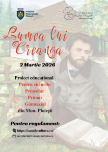 Evenimente Casa de Cultura Ploiesti Proiect „Lumea lui Creangă”, 02 martie 2026 Proiect „Brâncuși aproape de infinit”, 19 februarie 2026 Concurs de debut literar „Nichita Stănescu”, martie 2026 Ziua Națională a Lecturii, 15 februarie 2026 Proiect „Aproape de Caragiale”, 30 ianuarie 2026 Ziua Culturii Romane – Concurs județean de recitări „Ca un luceafăr am trecut prin lume”, 12-28 ianuarie 2026 Ziua Culturii Romane – „Aproape de Eminescu” – 15 ianuarie 2026 Festivalul „E vremea colindelor” Dans și energie pentru seniorii 60+ „Spectacolul lumii – In memoriam Ioan Grigorescu”, 20 octombrie 2025 Concursul Naţional de Poezie „Iulia Hasdeu”, ediția a XXIII-a, octombrie 2025 Tabăra de Creație Literară „Ion Stratan”, ediția a V-a, 02-05 octombrie 2025 Anunturi Câștigătorii la Concursul National de poezie Iulia Hasdeu Citește Mai Mult Rezultatele la preselectia pentru Festivalul Castanilor 2025 Citește Mai Mult Comunicat de presă câștigători Festivalul Național „I.L. Caragiale” – 2025 Citește Mai Mult Comunicat de presă câștigători Concurs Județean de recitări pentru liceeni, ianuarie 2025 Citește Mai Mult Comunicat de presă câștigători Concurs de artă plastică „Ploiesti, oașul meu, oraș european” 2024 Citește Mai Mult Rezultatul final al evaluării anuale a managementului Casei de Cultură „Ion Luca Caragiale” a Municipiului Ploiești-26 aprilie 2024 Citește Mai Mult Rezultate preselectie la Concursul Național de Muzică Folk „Festivalul Castanilor – In memoriam Gabi Dobre”, 2023 Citește Mai Mult Rezultat final la concursul pentru ocuparea postului de referent de specialitate IA Citește Mai Mult Rezultate proba interviu pentru ocuparea postului de referent de specialitate IA Citește Mai Mult