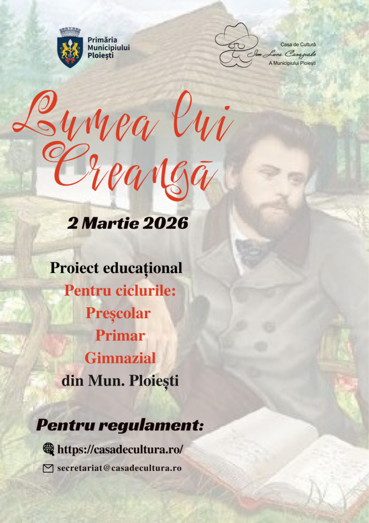 Proiect „Lumea lui Creangă”, 02 martie 2026 Posted by Casa De Cultura I.L. Caragiale Ploiesti | On 23 februarie,2026 | In Evenimente in derulare Propunere de colaborare LUMEA LUI CREANGĂ, 02 martie 2026 Inscriere Proiect „Lumea lui Creangă”, 02 martie 2026 Share on FacebookTweetFollow usSave Related Posts Calendar cultural pe anul 2022 Festivalul Concurs – Naţional de Folclor „Cunună de Cântec Românesc”, ediţia a VlI-a, Ploiești, 16-18 septembrie 2022 Tabăra Națională de Creație Plastică „Dan Platon”, ediția a XVI-a, Ploiești, 21-30 iunie 2022 About Author Casa De Cultura I.L. Caragiale Ploiesti