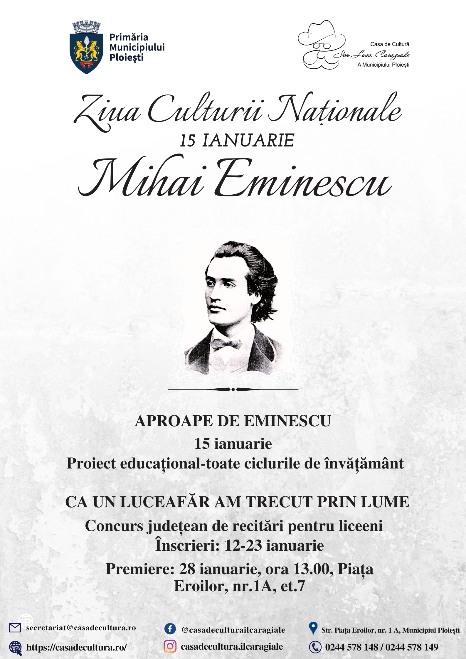 Ziua Culturii Române 15 ianuarie 2026 Posted by Casa De Cultura I.L. Caragiale Ploiesti | On 8 ianuarie,2026 | In Evenimente in derulare Share on FacebookTweetFollow usSave Related Posts E vremea colindelor ANUNT CONCURS DE ANGAJARE Ziua Culturii Naționale About Author Casa De Cultura I.L. Caragiale Ploiesti